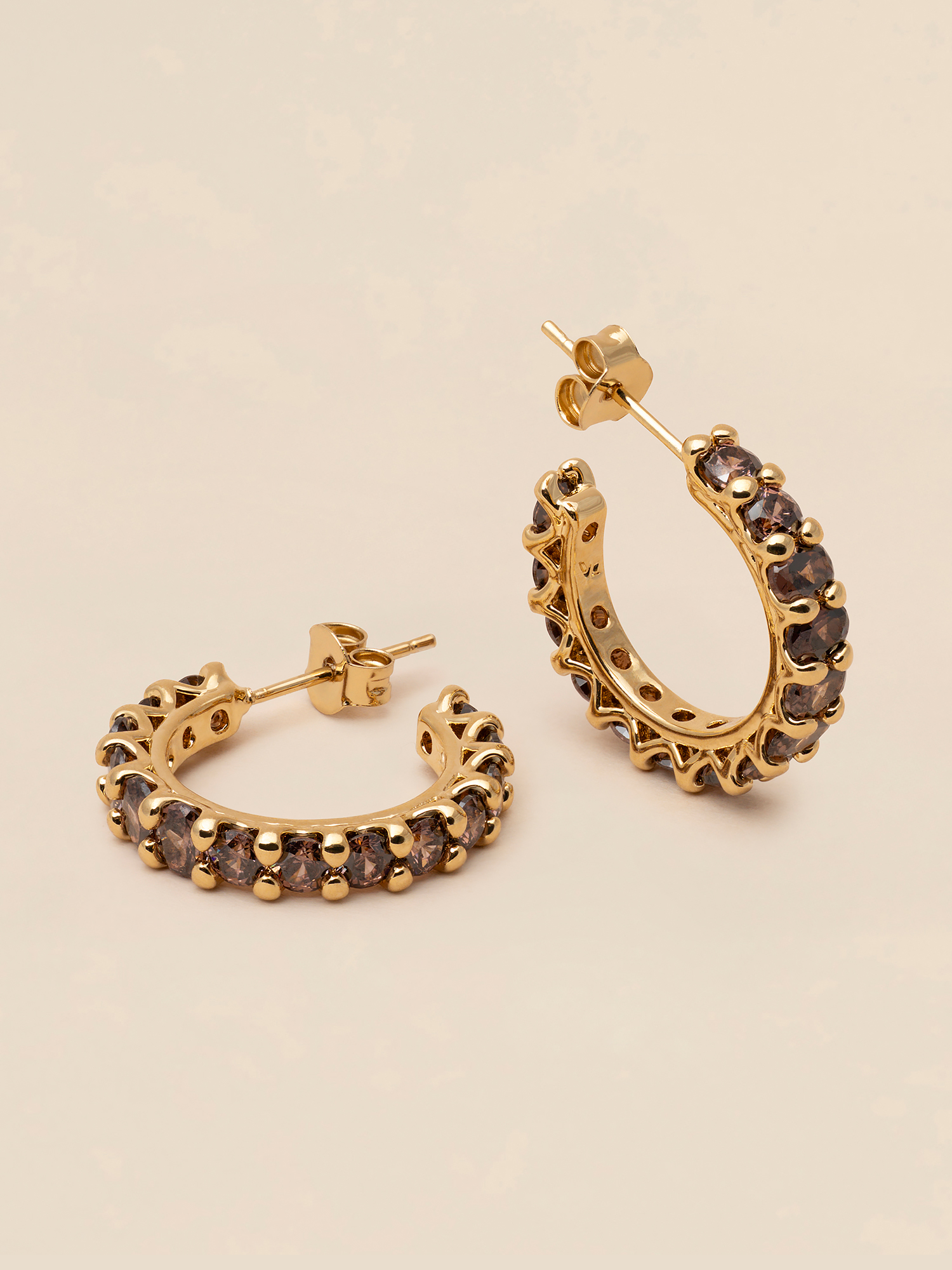 Instantly eye-catching, these stunning hoop earrings with a combination of brown coloured princess-cut oval stones and round cubics, inlaid in claws of 18k plated gold can be dressed up or down.