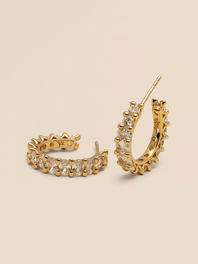 Instantly eye-catching, these stunning hoop earrings with a combination of crystal-coloured princess-cut oval stones and round crystals, inlaid in claws of plated gold can be dressed up or down.