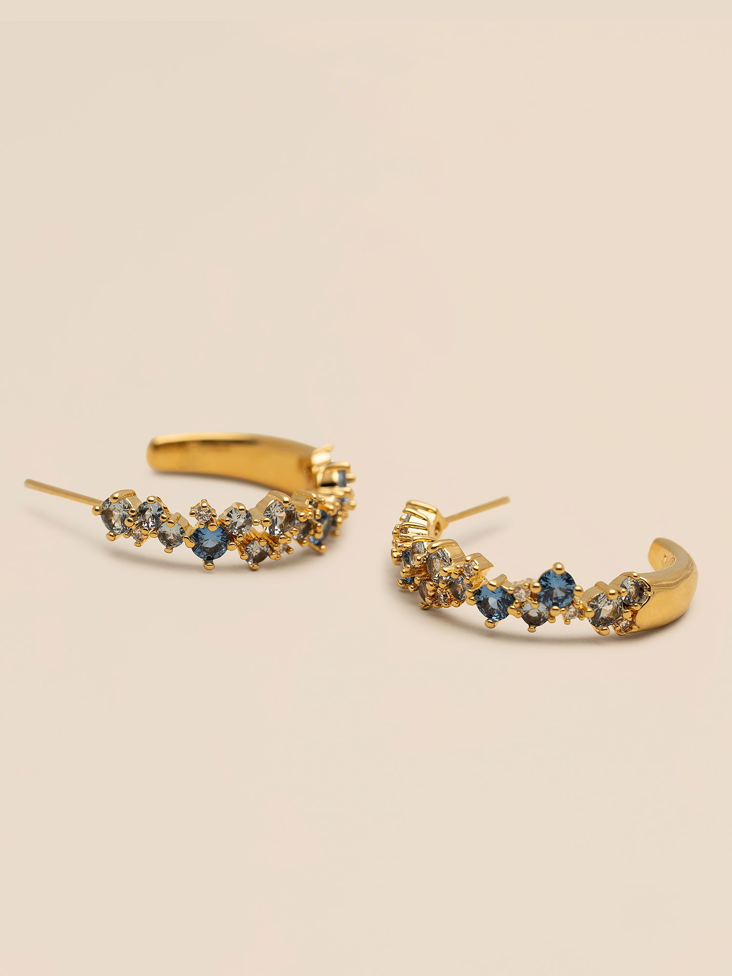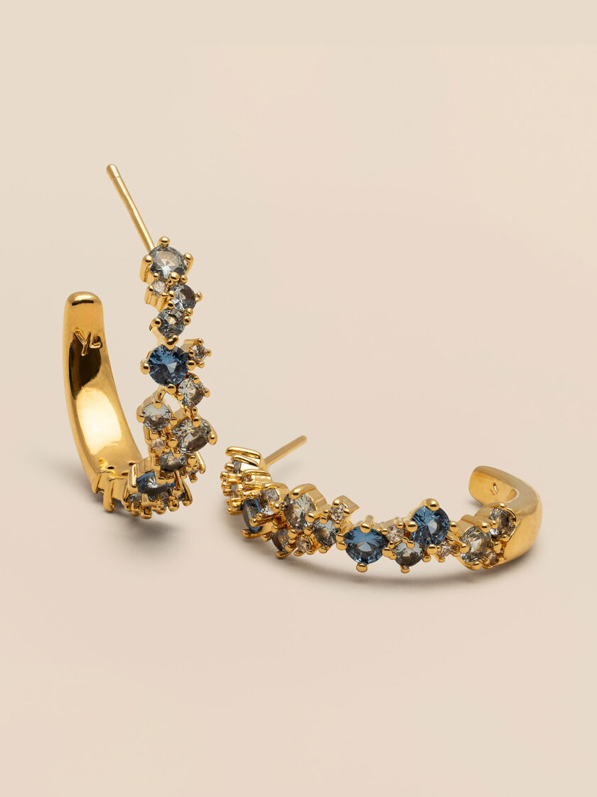 Our Meadow Avantgarde Hoops are adorned with an asymmetric cluster of contrasting blue shade stones. Each sparkling gem is delicately nestled amongst organic gold granules.